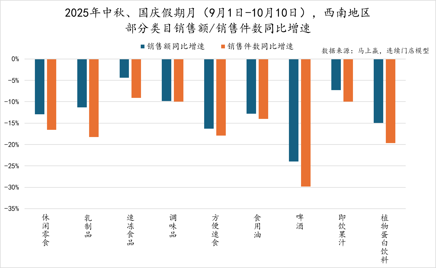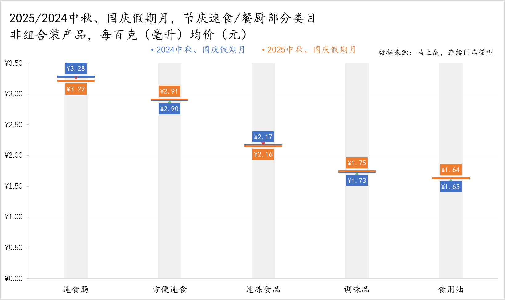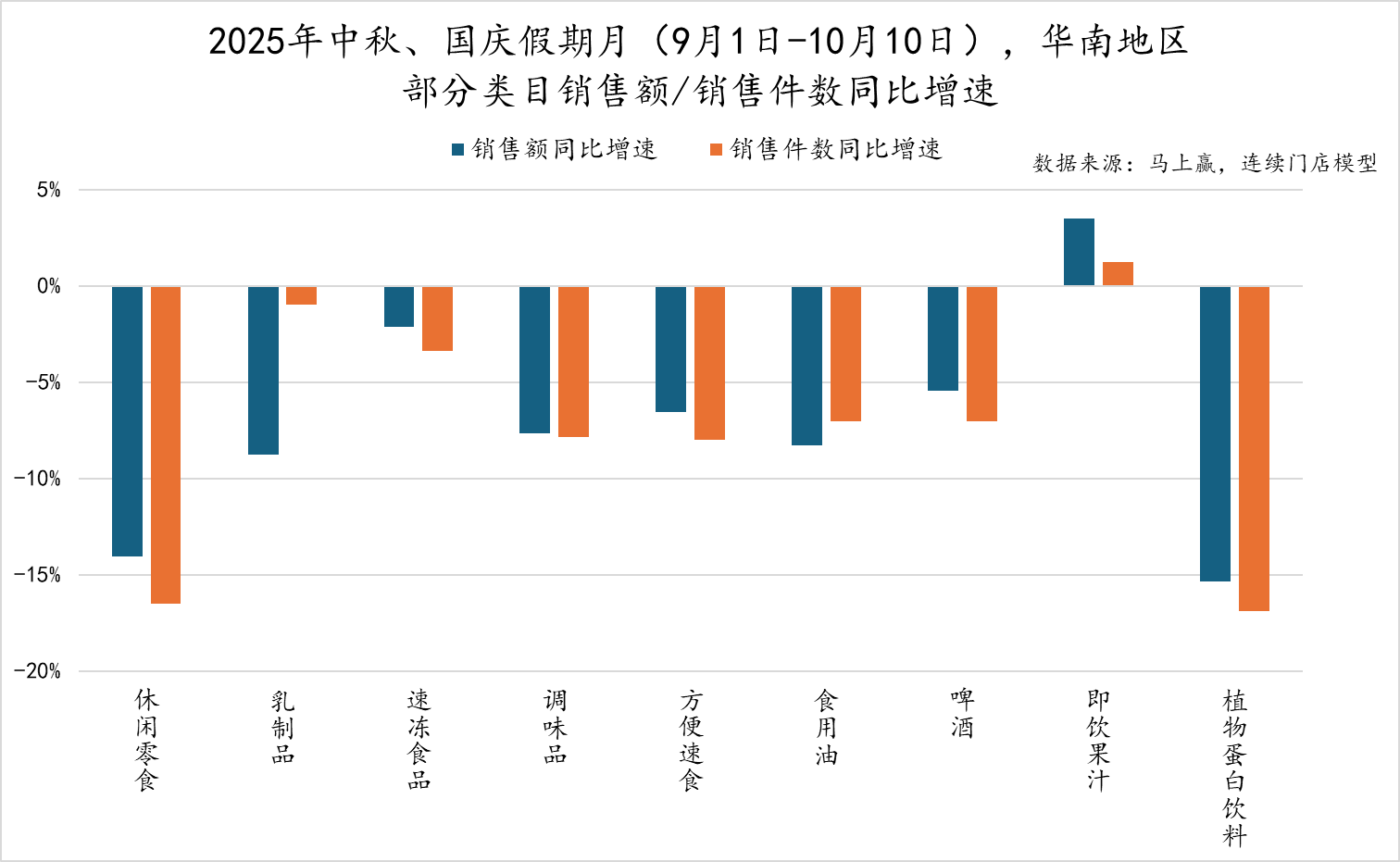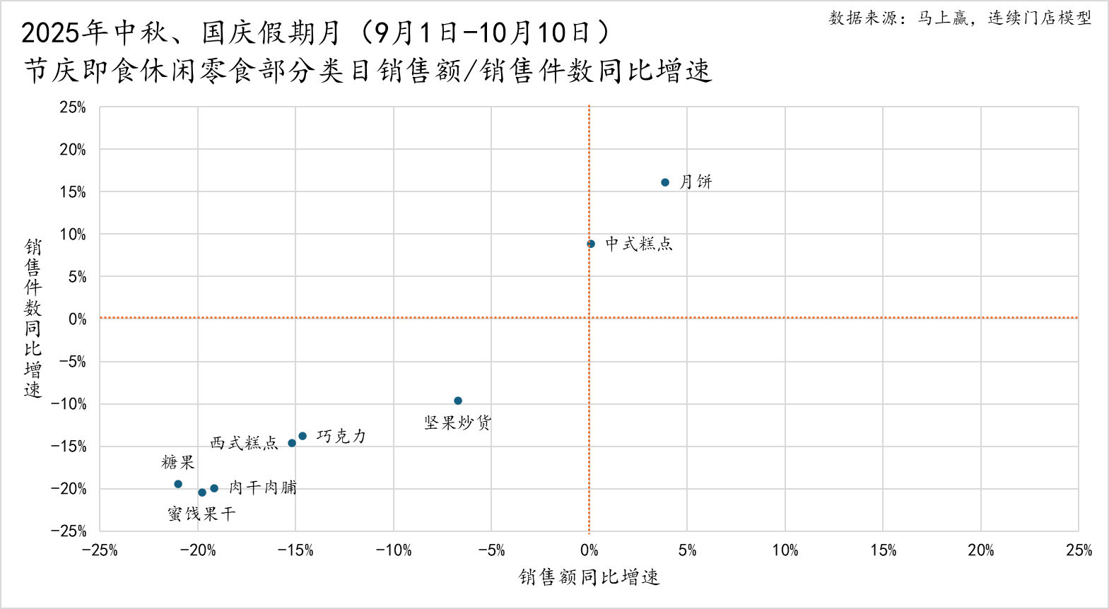 需要特别说明的是:2024年中秋节在9月月中,2025年中秋节在国庆期间,两年相比月饼等节庆风俗食品的消费期少了近一半,但由于国庆的时间均为10月1日-10月7日,因此再三权衡以上述时间段设置观察周期,已知的影响是“2025中秋、国庆假期月”时间段节庆风俗食品数据表现情况偏好(包括但不限于月饼)。