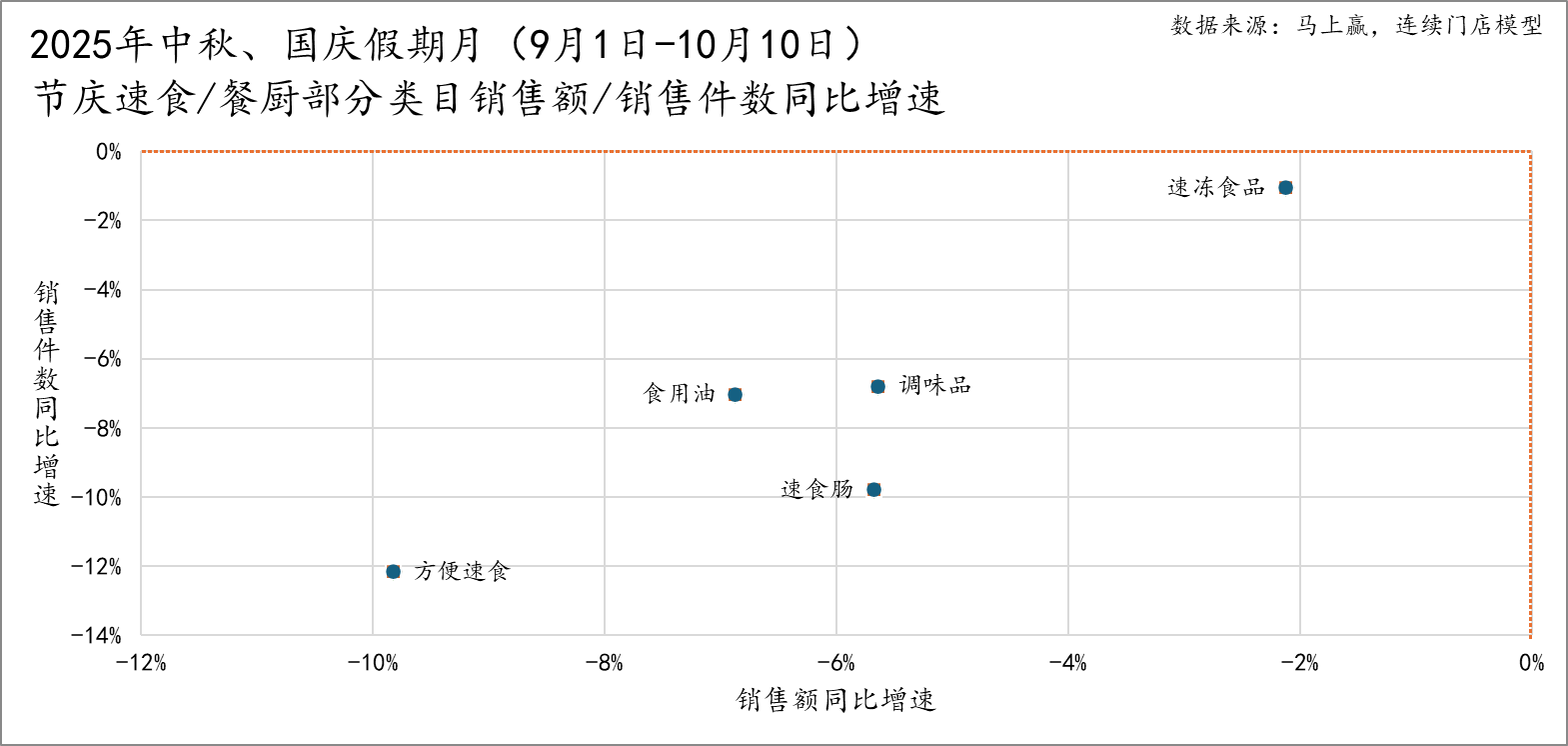 在这个方向上,我们主要选择了几个家内餐厨相关性较强的类目,分别是速冻食品、方便速食,以及食用油、调味品、速食肠。