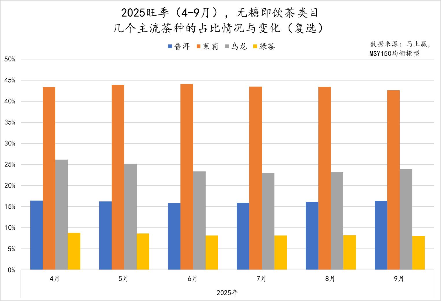 从茶种维度观察,不论是单一还是混搭,茉莉依然是占比第一的茶种,且在2025年旺季整体保持稳定;乌龙排名第二,在6、7月时占比稍有下行,但在9月又有所回升;排名第三的普洱、第五的绿茶基本占比稳定,波动较小。