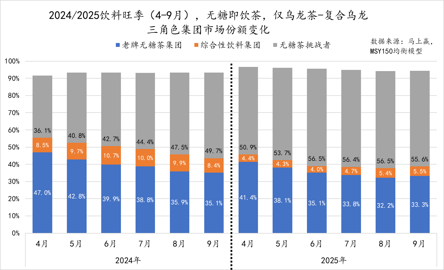 首先是2024/2025年旺季,三个角色的市场表现情况,可以看到相比2024年旺季,2025年旺季期间,老牌无糖茶集团依然占据市场主力地位,且从2025/2024旺季同比来看,仍有一定的市场份额提升。综合性饮料集团与无糖茶挑战者在2025年旺季的市场份额,同比2024年旺季均有缩减。市场份额绝对值缩减较多的是综合性饮料集团,其市场份额加总目前不足10%,且在旺季中有进一步缩减的趋势。相比来说,无糖茶挑战者在2024年旺季时还能稳定在5%左右的市场份额,但到2025年旺季尾部的8、9月时,其加总的市场份额仅剩3.4%,市场空间被进一步压缩。