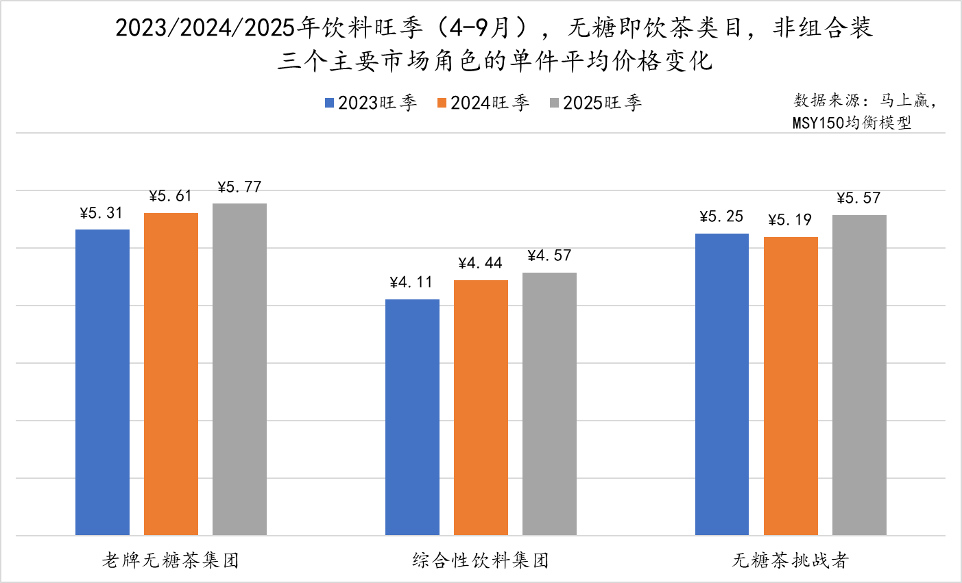 在规格上,三个角色在2023-2025年旺季表现出了不同的趋势,但在2025年旺季时已经趋于靠拢。其中,老牌无糖茶集团、无糖茶挑战者集团的平均规格有着较为明显的上升,体现出大规格化的趋势。品牌们正在通过进一步的规格细分,适应不同消费场景的需求。相比来说,综合性饮料集团的平均规格虽然在三者之间处于高位,但并未显著呈现上升趋势,2025年旺季同比2024年仅有轻微增长。
