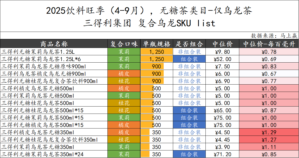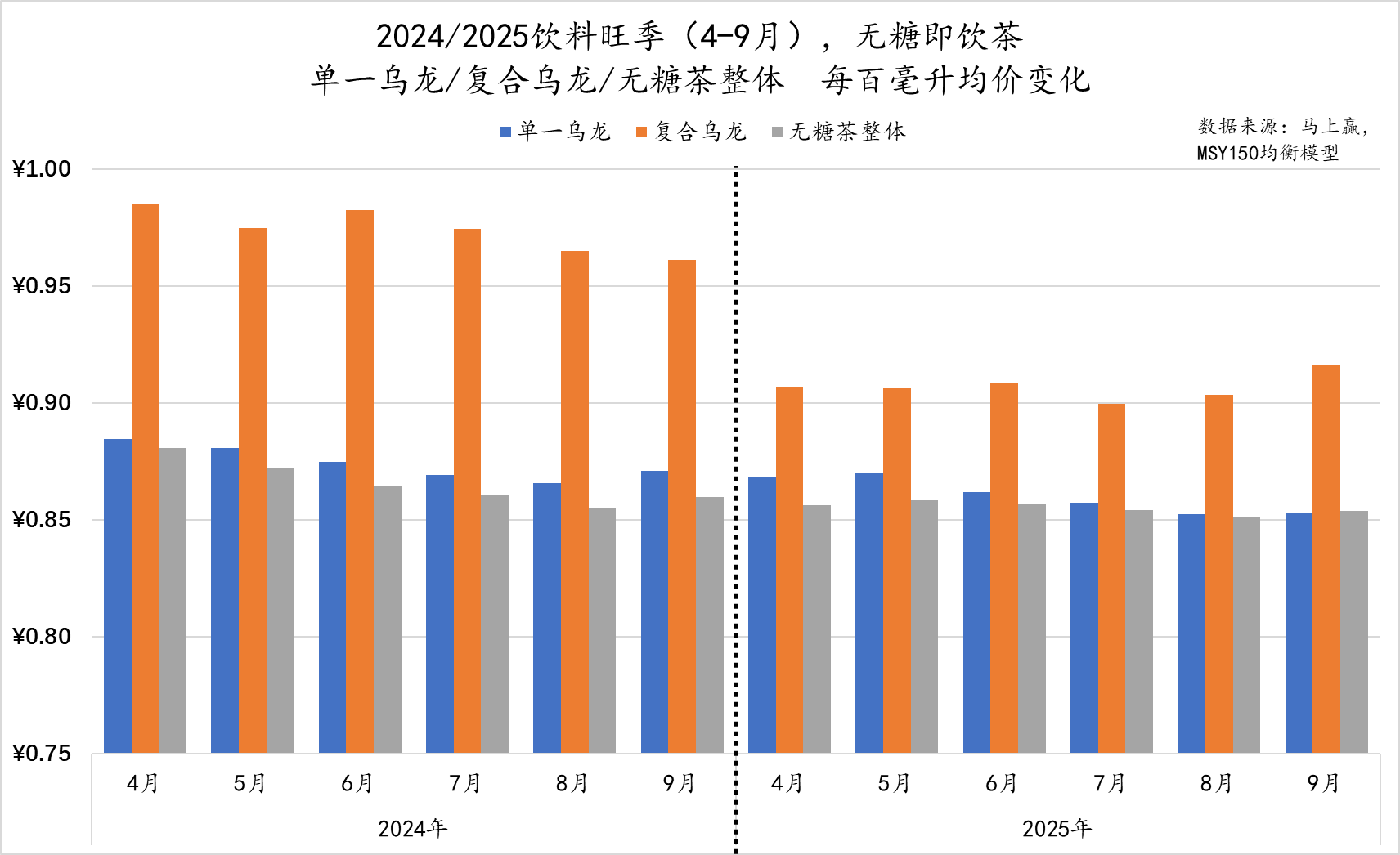 上文中,已经提及了部分无糖茶内乌龙茶种的占比、以及价格上的变化。整体来看,乌龙的占比在无糖茶类目中整体保持稳定,价格上则在2025年旺季相比2024年,有一定的件均价同比上升迹象。