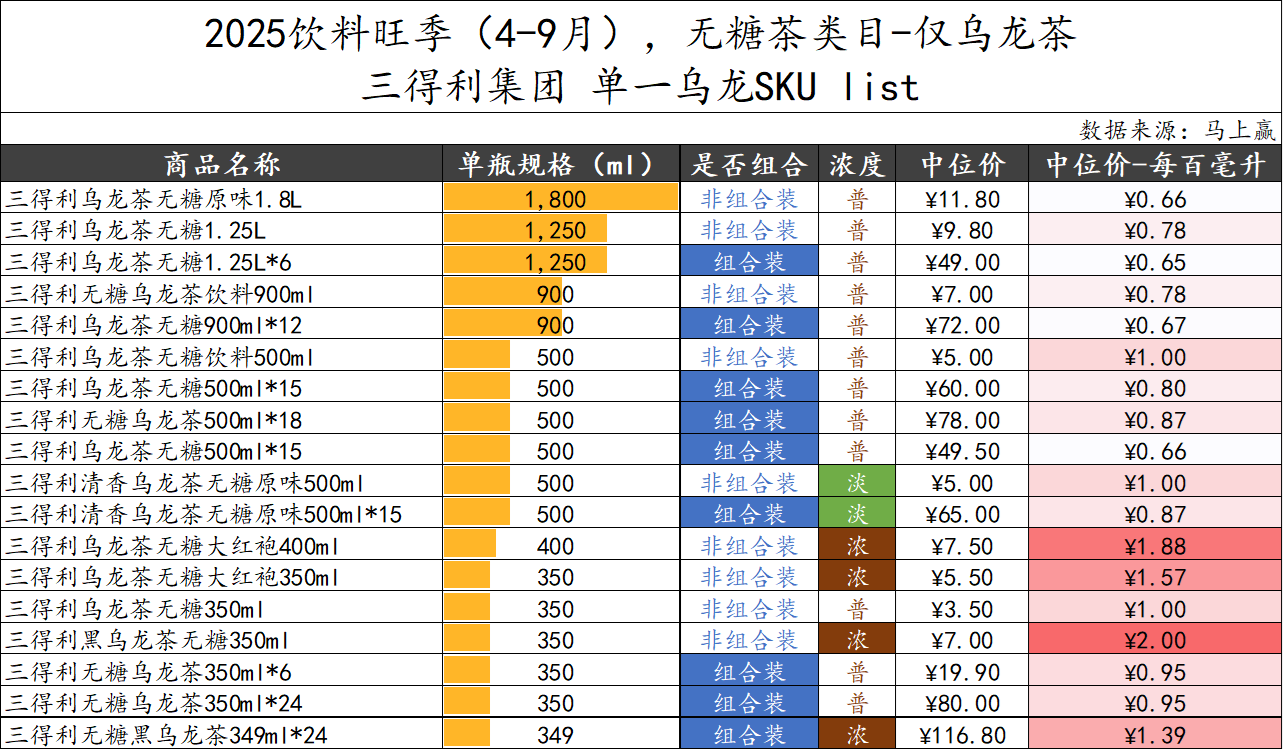 首先来看三得利品牌单一乌龙的SKU产品清单。基于马上赢品牌CT,三得利共计18个单一乌龙SKU中,覆盖了从淡到浓的各种风味、从349ML便携装到1800ML家庭装的各种规格、从6到24瓶的不同组合数量,形成了完整的单一乌龙产品矩阵。通过将代表着品牌最强心智的大单品矩阵化,可以尽可能满足不同消费场景,不同消费习惯,不同消费量的消费者的消费需求。