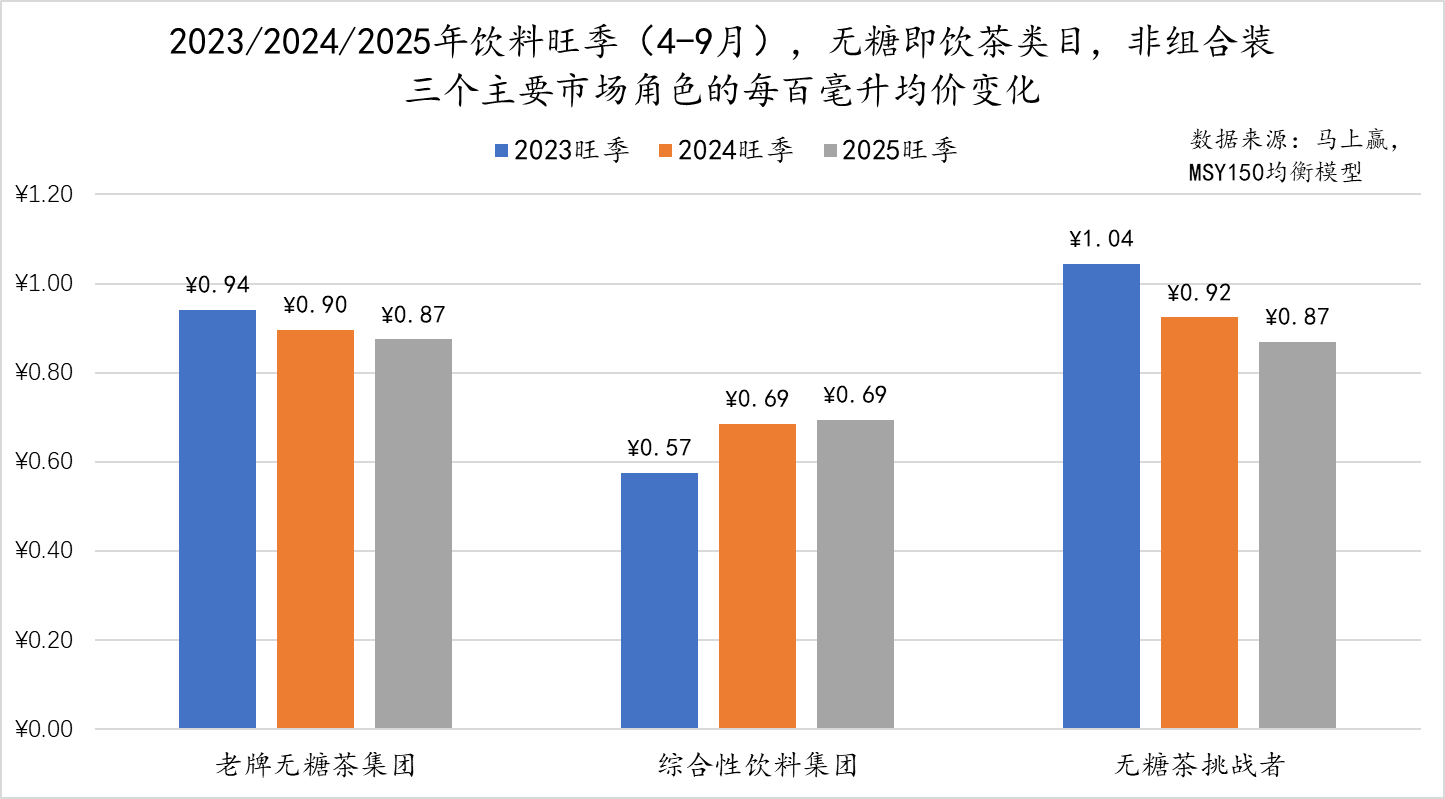 百毫升均价则呈现出了不同的表现情况:其中老牌无糖茶集团的百毫升均价整体平稳略有下跌,但依然显著高于综合性饮料集团,在2025年旺季与无糖茶挑战者已经基本持平;综合性饮料集团在2024年旺季同比2023年有显著的上涨,2025年旺季与2024年同比基本保持一致;变化较大的依然是无糖茶挑战者下的几个集团,其百毫升均价自2023年旺季至2025年旺季均呈现明显的下探,从2025年旺季与2023年旺季相比,百毫升均价下降了近20%。