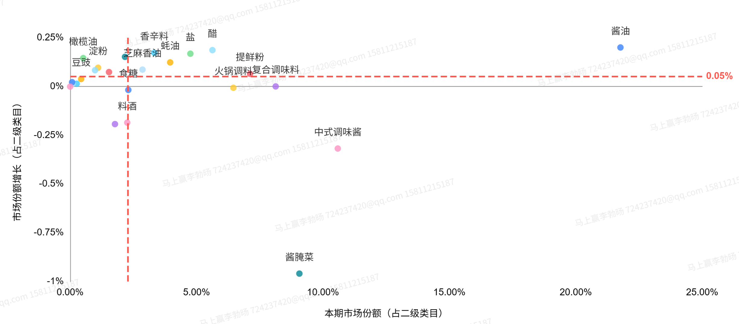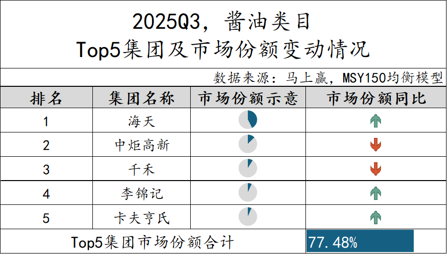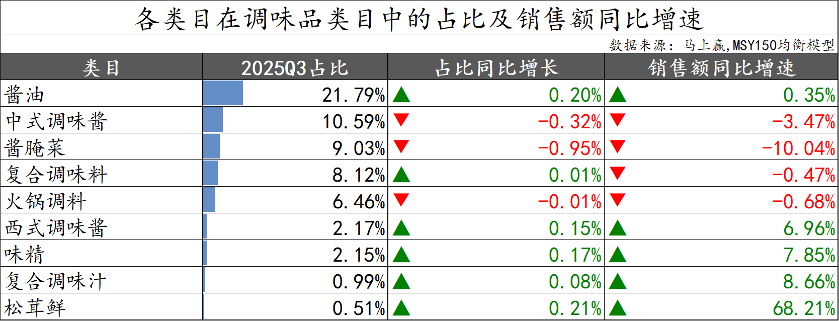 在本季度,我们选取了酱油、中式调味酱、酱腌菜、复合调味料、火锅调料、西式调味酱、味精、复合调味汁、松茸鲜共9个较有典型性与代表性的类目进行增速与类目内情况的观察,以2025Q3重点类目的市场份额计算,上述9个类目的市场份额合计>61%。