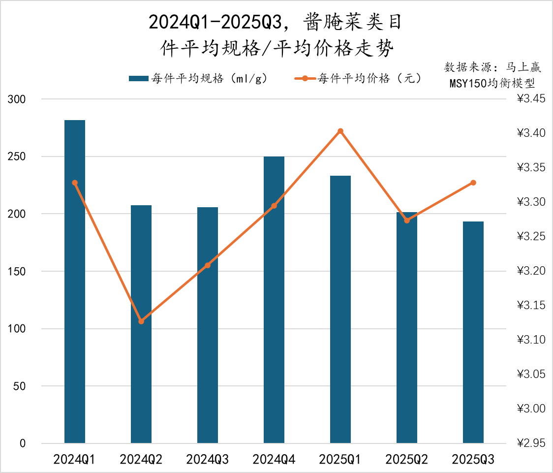 2024Q1至2025Q3,酱腌菜类目的件均规格与件均价格整体呈现“规格持续下行、价格波动明显”的走势。件均规格从2024Q1的270g左右降至2025Q3不足200g,普遍高盐高钠的酱腌菜类型产品或将在未来进一步走向规格小型化,以适应消费者减少单次消费量的趋势。件均价在2024Q2下滑幅度较大,降低至3.1元,随后逐季攀升至2025Q1的3.4元,2025Q2略有回落后又小幅提升。