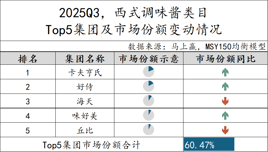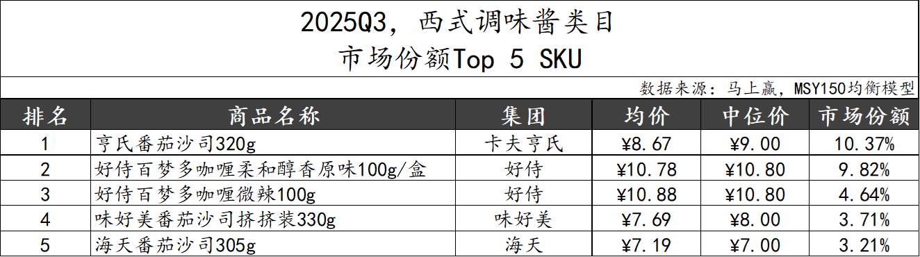 2025Q3,西式调味酱类目市场份额TOP 5 SKU来自卡夫亨氏、好侍、味好美和海天四个集团。从风味来看,主要为番茄沙司和咖喱两类产品,或可证明西式调味酱的主流消费需求仍集中于基础、高频、场景稳定的品类,消费者对经典口味的偏好明显。从市场份额来看,TOP 5 SKU市场份额合计超过30%。