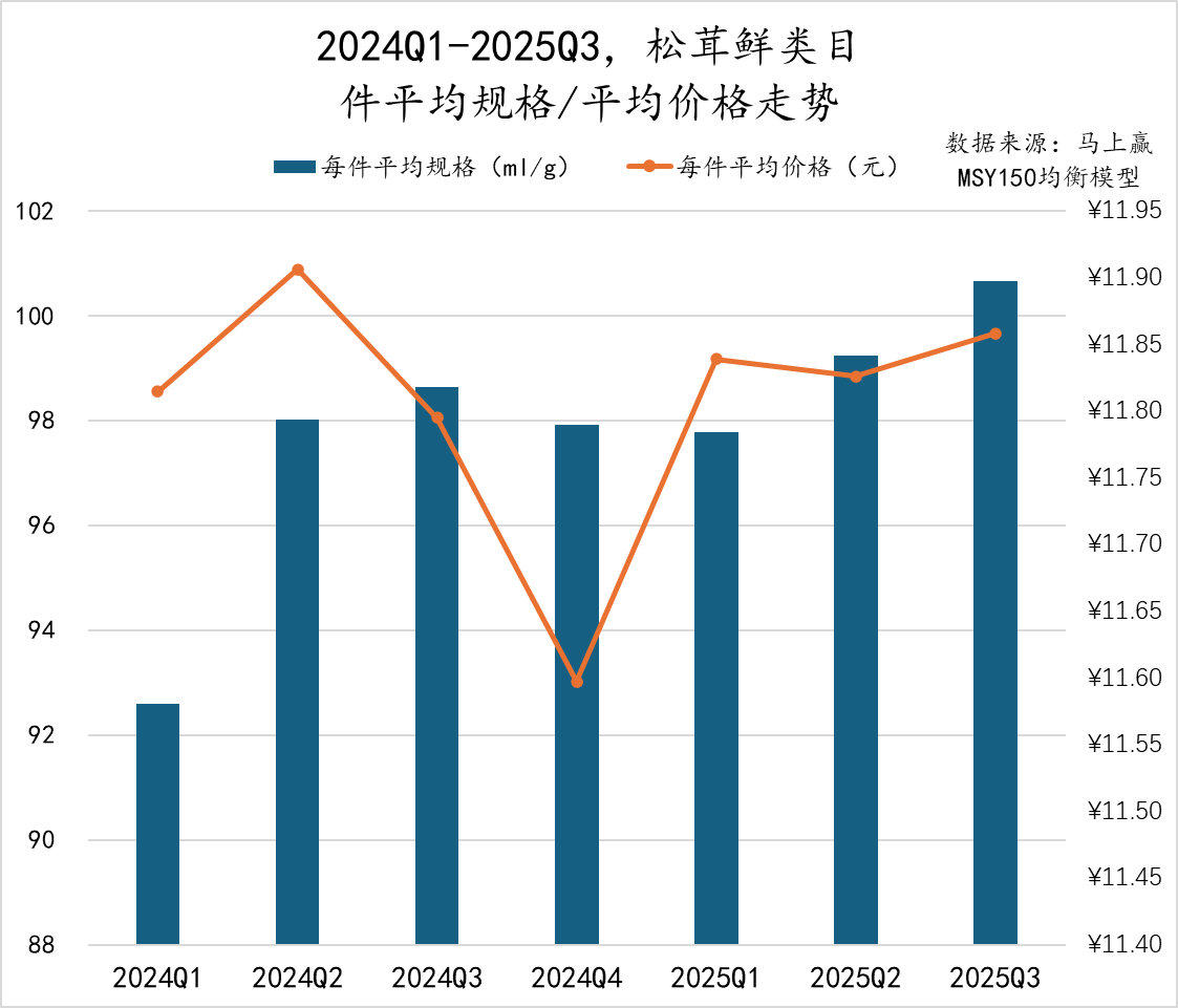 2024Q1至2025Q3,松茸鲜类目的件均规格整体保持上行态势,从2024Q1的92g大幅提升至2024Q2的98g,随后波动提升至2025Q3超过100g/PCS,推测可能与通过增大规格提升产品性价比相关;件均价格则在11.6–11.9元之间波动,2024Q1上升至最高点11.9元后连续两个季度降低至2024Q4的11.6元,2025Q1回升至11.85后趋于稳定。总体来看,松茸鲜类目在近几个季度呈现出“稳价增量”的趋势。