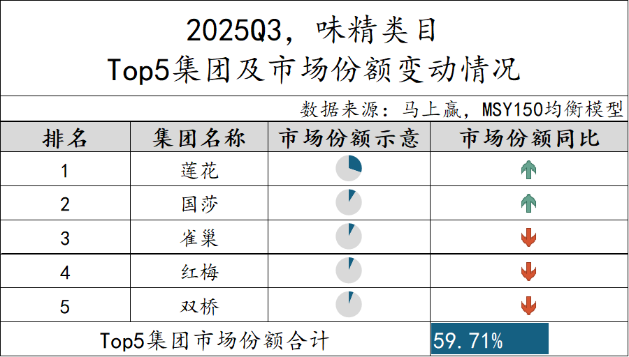 2025Q3,味精类目的TOP 5集团由莲花、国莎、雀巢、红梅和双桥集团构成,市场份额合计59.71%。从市场份额同比变动情况来看,排名前两位的莲花与国莎集团市场份额同比呈现上升,其后的三个集团市场份额则出现同比下跌。