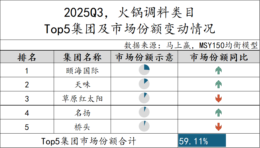 2025Q3,火锅调料类目TOP 5市场份额合计为59.11%,市场集中度较上一季度有所提升,但整体依然处于中等水平。从市场份额同比变化来看,颐海国际、天味、名扬市场份额进一步提升,而草原红太阳和桥头则呈现同比下滑。