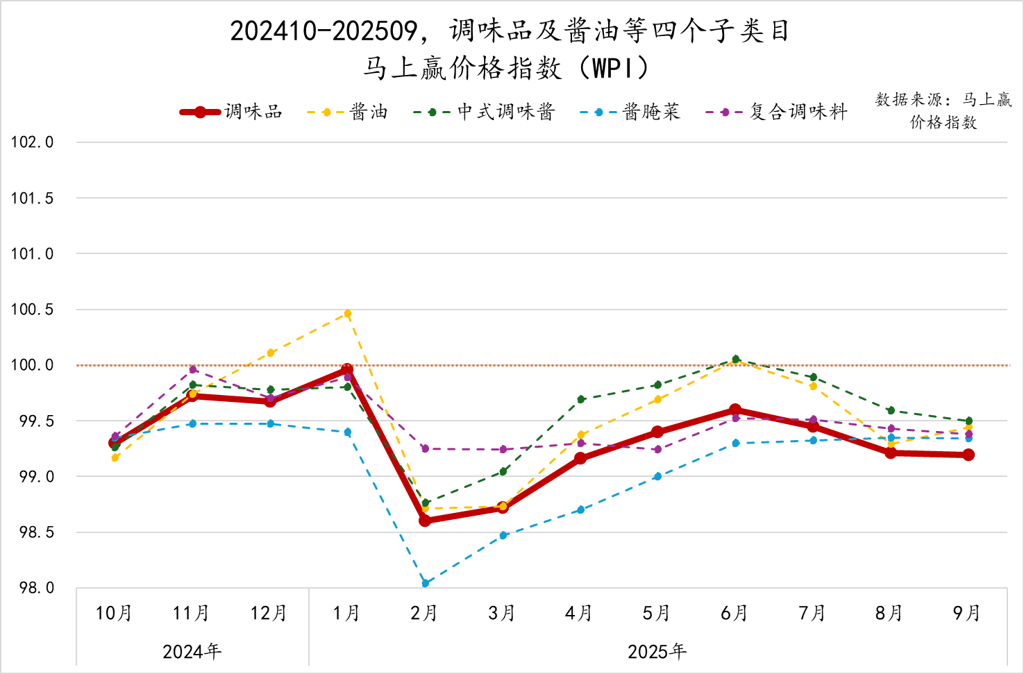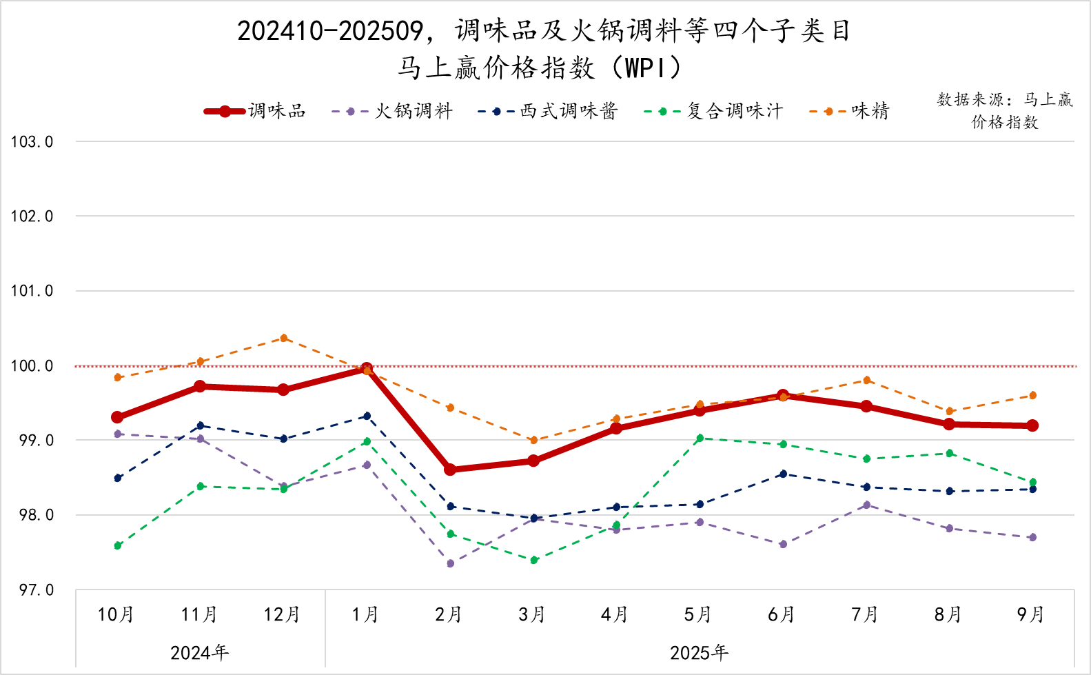为了更好地分析类目价格的变动与走势,我们拉取了202409-202510,调味品类目整体及各重点类目的马上赢价格指数。马上赢价格指数(WPI)以100为基准值,其数值上下波动为类目的价格指数与去年同期价格指数的相对百分比,100表示与去年同月持平,高于100表示同比价格水平上升,低于100则表示同比价格水平下降。