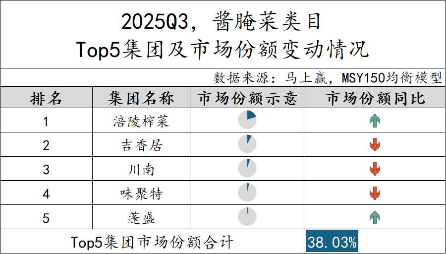 2025Q3,酱腌菜市场集中度也处于较低水平,TOP 5市场份额合计38.03%。其中,涪陵榨菜位列第一的同时,市场份额依然同比增长,蓬盛的市场份额也有所提升。而吉香居、川南和味聚特的市场份额同比则出现下降。在酱腌菜类目中,第一名的涪陵榨菜集团有着较为明显的领先优势,第二~第五名的集团之间市场份额则差距不大,排名波动或时有发生。