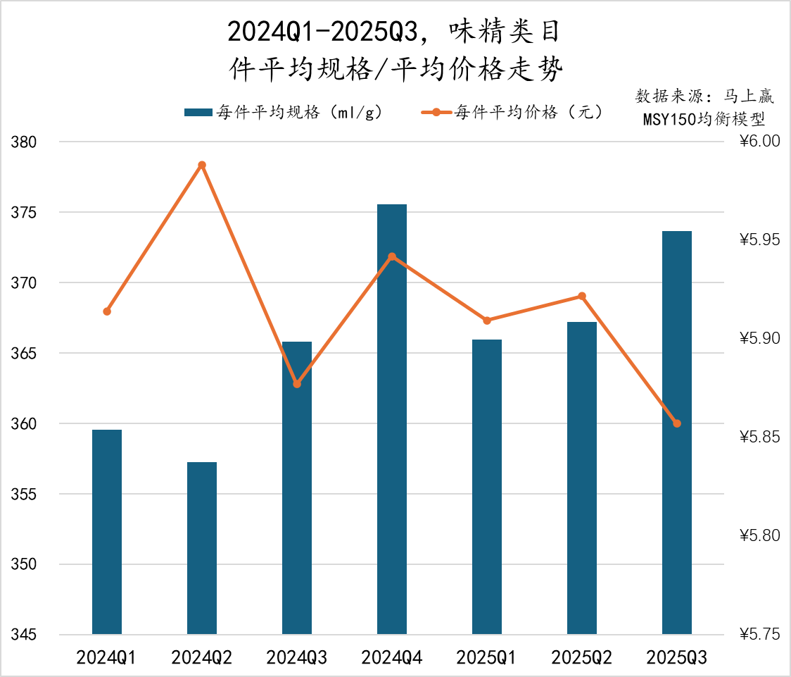 2024Q1至2025Q3,味精类目的件均规格与件均价整体呈现“规格波动上升、价格小幅回落”的走势。件均规格从2024Q1的359g提升至2025Q3的373g,整体波动幅度有限但呈现温和上行。件均价则从5.92元左右小幅下降至5.85元,价格轻微回落。