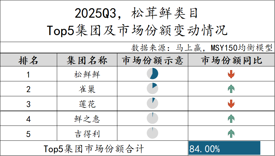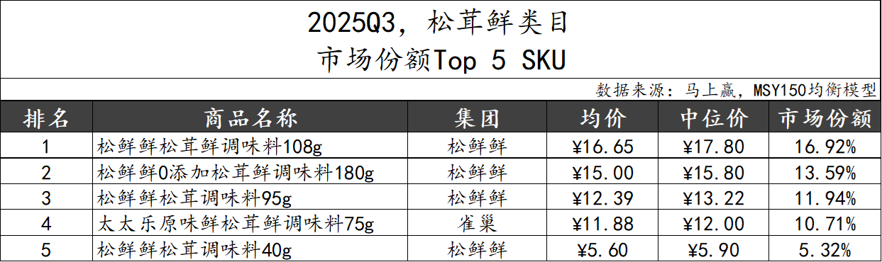 2025Q3,松茸鲜TOP 5集团市场份额合计高达84%,集中度在调味品类目中属于较高的水平,也或许与类目仍然较新处于起步阶段,目前市场参与者依然有限相关。具体来看,松鲜鲜集团市场份额过半,但市场份额同比有所下跌,同样或是因为类目快速扩张参与者快速增加的原因,同比下跌的还有位列第三的莲花集团。而雀巢、鲜之惠和吉得利三个集团的市场份额则同比提升。