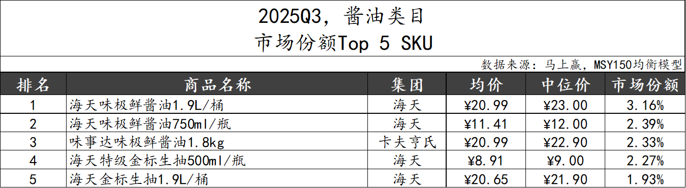 2025Q3,酱油类目市场份额TOP 5 SKU中,市场份额第一的海天集团表现强势,“味极鲜”和“金标”两个系列凭借不同规格共占据四个席位,卡夫亨氏的“味事达味极鲜酱油”则占据第三。