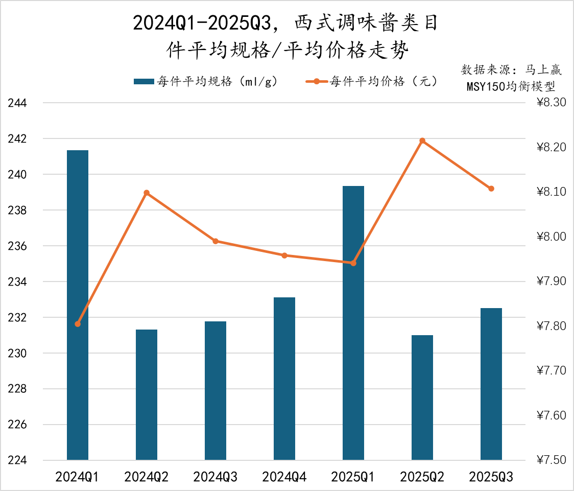 值得注意的是,从2025Q1-Q3同比2024Q1-Q3的情况来看,西式调味酱的件均规格基本持平,但件均价却呈现同比上涨。
