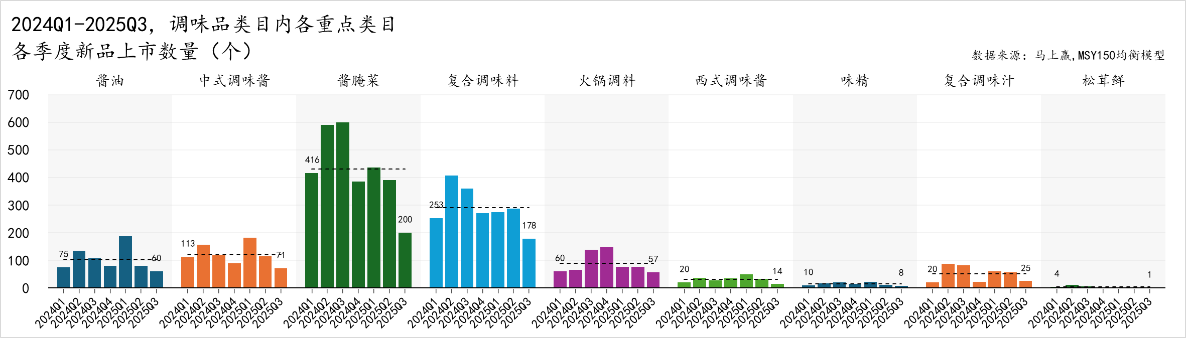 整体来看,2024年调味品各主要类目的新品数量普遍高于2025年同期,2025年Q1以后,各类目上新规模普遍都呈现一定收缩态势。