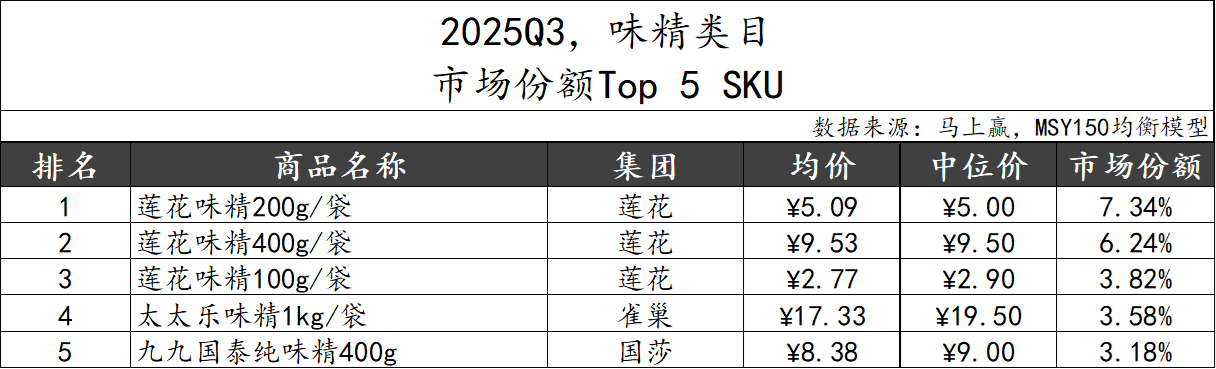 味精类目市场份额TOP 5 SKU中,莲花集团表现亮眼,三款产品占据了前三名,雀巢集团则依托“太太乐”品牌的高知名度和大规格位列第四,国莎集团也有一款产品上榜。