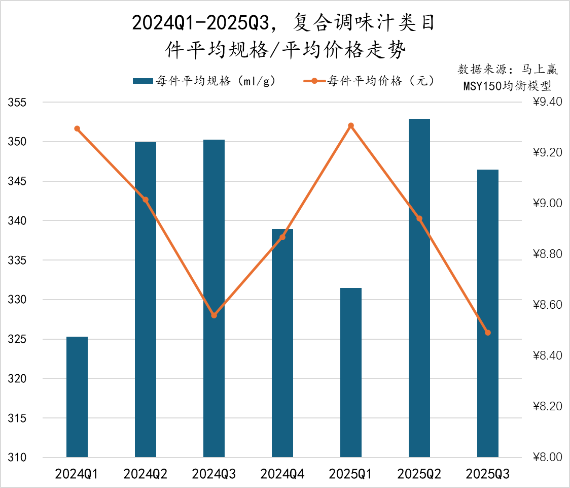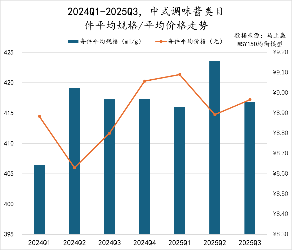 2024Q1至2025Q3,中式调味酱的件均规格与件均价格总体呈现“规格稳中微升、价格波动变化”的走势,件均规格方面,除2024Q1和2025Q2外,其余季度在415ml/g至420ml/g之间小幅震荡。件均价方面,2024Q2从8.9元下跌至8.6元,随后连续三个季度提升超过9元,达到近七个季度最高点,2025Q2略有回落后再度回升。