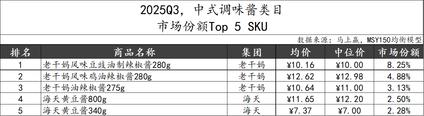 2025Q3,中式调味酱类目市场份额TOP 5 SKU由老干妈和海天集团占据。作为市场份额占比最高的集团,老干妈凭借不同风味产品占据前三席,市场份额合计超过16%,展现出头部品牌的市场掌控力。海天也凭借经典“黄豆酱”,以两种不同规格的产品位列第四和第五。