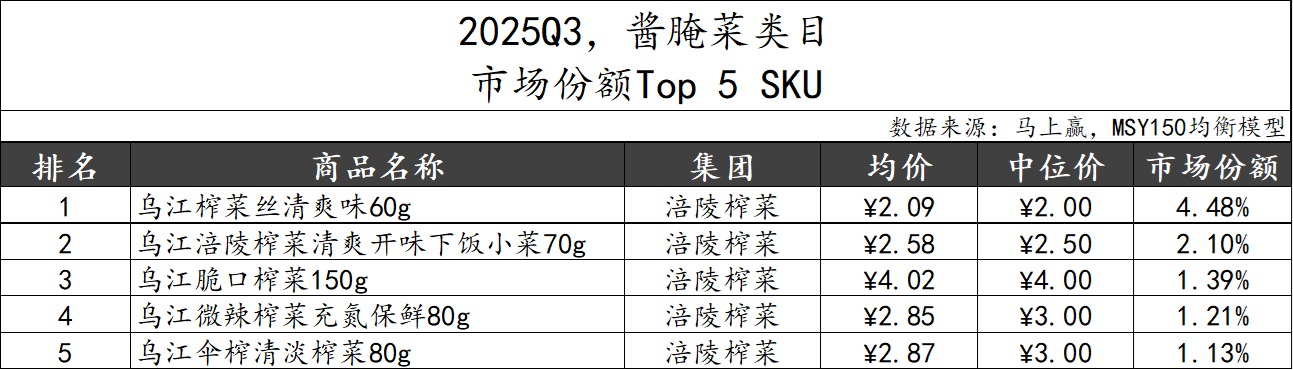 2025Q3,酱腌菜类目市场份额TOP 5 SKU中,龙头集团涪陵榨菜以不同口味和规格产品包揽所有席位,清淡产品也登上TOP SKU清单,未来可能伴随消费者减盐的潮流而取的进一步的提升。