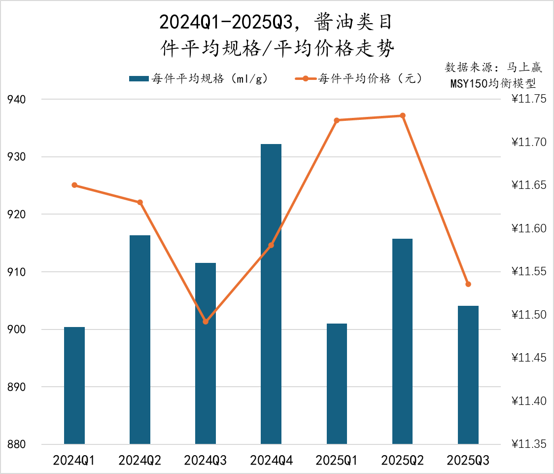 2024Q1至2025Q3,酱油类目件均规格和件均价走势相似,显示出明显的季节性变化。规格方面,2024年和2025年的Q1至Q3均在900ml-920ml区间波动且走势相同,2024Q4件均规格明显大幅提升超过930ml。价格方面,2024Q1至Q3连续两个季度下跌,随后连续三个季度提升至近11.74元左右,达到近七个季度最高点,但2025Q3下滑不足11.55元。