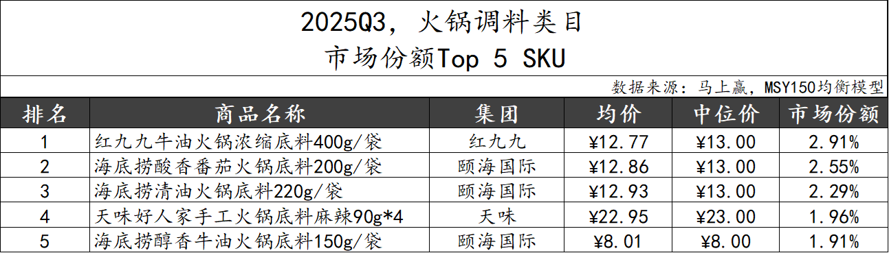 从市场份额TOP 5 SKU来看,尽管红九九不属于TOP 5集团,但其代表性的牛油火锅浓缩底料产品却位列第一。颐海国际作为头部集团,有三款不同风味产品位列第二、第三和第五。天味集团的小规格组合装产品也凭借“一人食”场景的适配,位列第四。