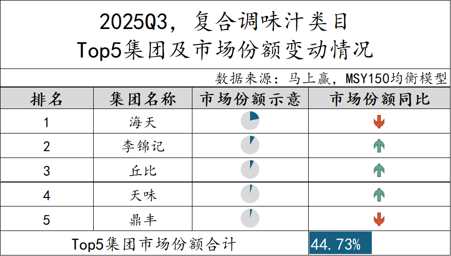 2025Q3,复合调味汁类目TOP 5集团市场份额合计44.73%,较上个季度有所缩减。值得关注的是,天味和鼎丰集团代替上一季度的今明后和加加跻身第四和第五。从市场份额同比变动来看,占比最高的海天集团同比有所下降,排名第五的鼎丰集团也同比下滑,而李锦记、丘比和天味集团市场份额则同比上升。整体来看,复合调味汁市场格局不断重塑,消费者对多元风味与差异化产品的需求也不断增强。