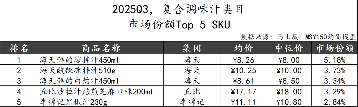 2025Q3,复合调味汁类目市场份额TOP 5 SKU中,海天以丰富的产品矩阵占据前三席,丘比则以经典中高端产品“沙拉汁焙煎芝麻口味”跻身第四,李锦记也有一款“黑椒汁”进入榜单。TOP 5 SKU的口味和适用场景均不完全相同,显示出复合调味汁市场的多元化竞争态势。