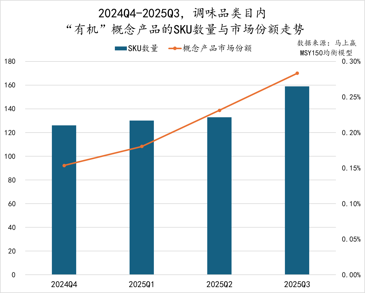 尽管“有机”概念产品在整体调味品市场中的占比仍然较低,但增长趋势显示出消费结构正逐步向品质化与健康化方向演进。其快速增长可能也与零添加等概念的监管态度明朗后,高端消费者需求流向“有机”相关有关。