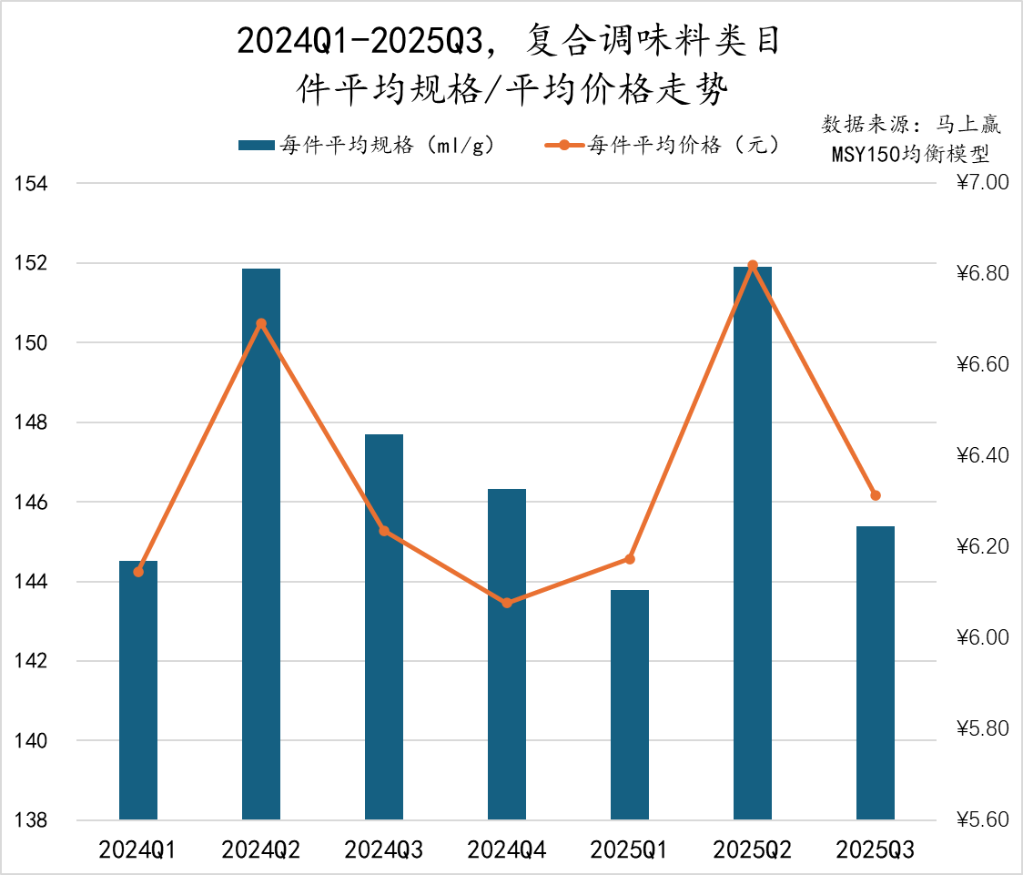 2024Q1至2025Q3,复合调味汁类目的件均规格与件均价呈现出反向变化的趋势。2024Q1至Q3,件均规格呈现小幅度的波动上升,件均价则呈现小幅度的波动下降。另外,或是受到春节等节庆的影响,复合调味汁在Q1与其他季度的件均规格、件均价格表现也有较大差异。