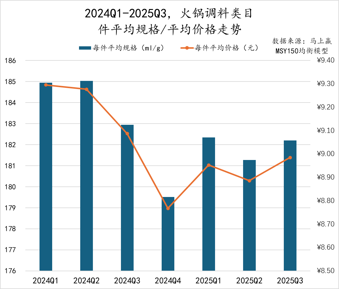 2024Q1至2025Q3期间,火锅调料类目的件均规格总体呈小幅下降趋势,从约185g逐步下降至180g左右,产品规格变化上或在延续“小包装化”发展趋势。与此同时,件均价格则从2024Q1的9.3元下降至2024Q4的8.8元后,在2025年逐步回升至9元附近。