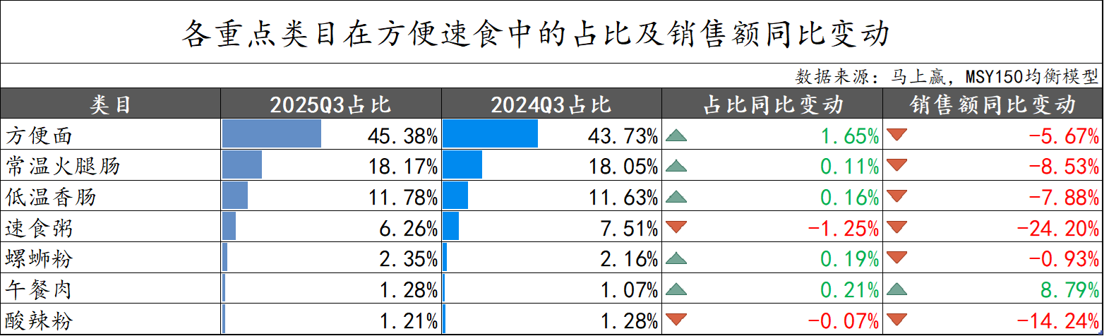 在方便速食大类中,本季度我们重点选择了:方便面、常温火腿肠、低温香肠、速食粥、螺蛳粉、酸辣粉、午餐肉共计7个较有典型性与代表性的类目进行回顾。以2025Q3的类目占比计算,上述重点类目在方便速食中的占比合计>86%。