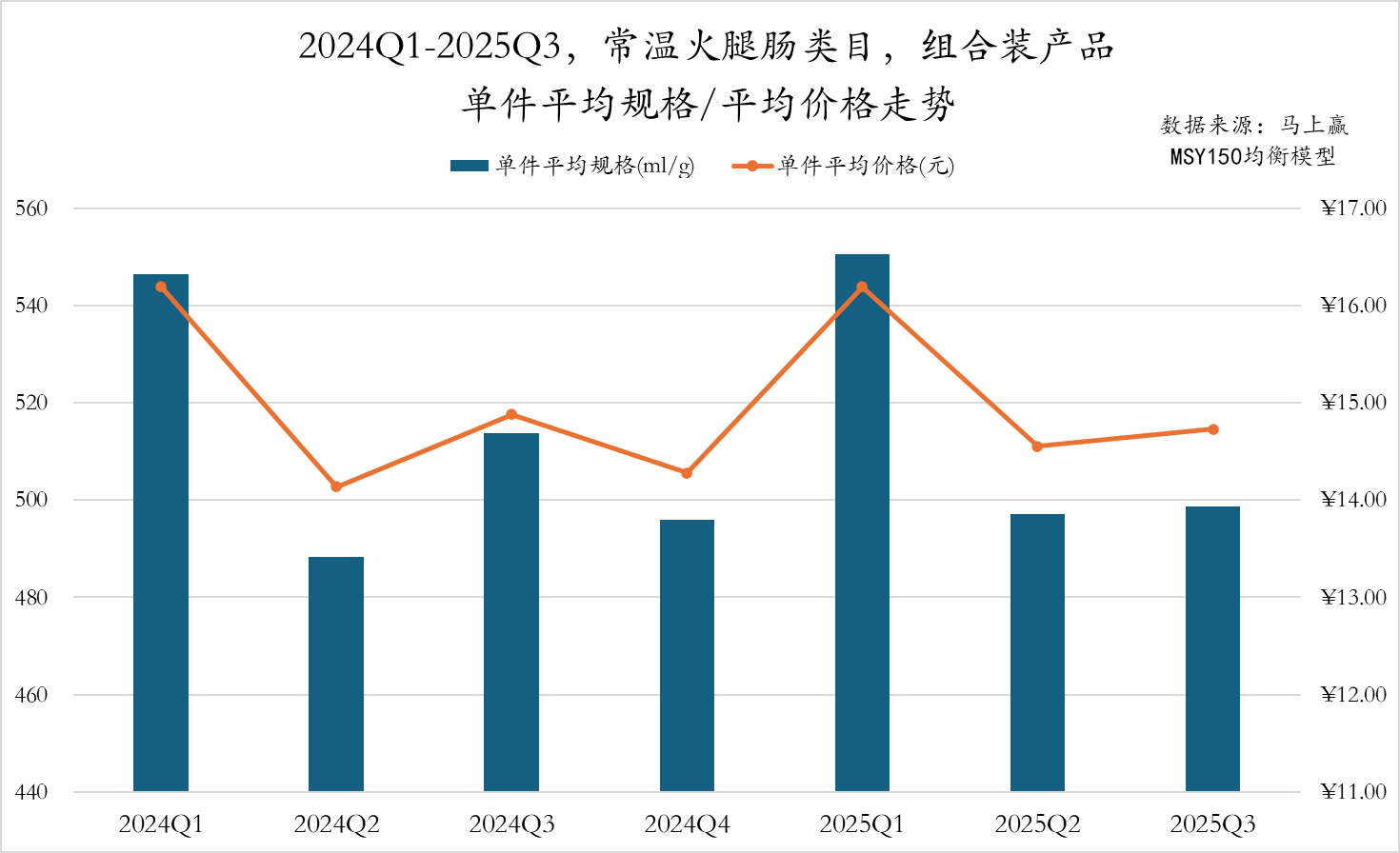 从组合装来看,常温火腿肠的单件平均规格和平均价格走势则呈现出明显的周期性变化。2024Q1与2025Q1,两个春节季度的单件平均价格均超过16元,单件平均高规格也超过540克,2024Q2则骤减。2025Q3的单件平均价格略有提升,单件平均规格相对平稳。