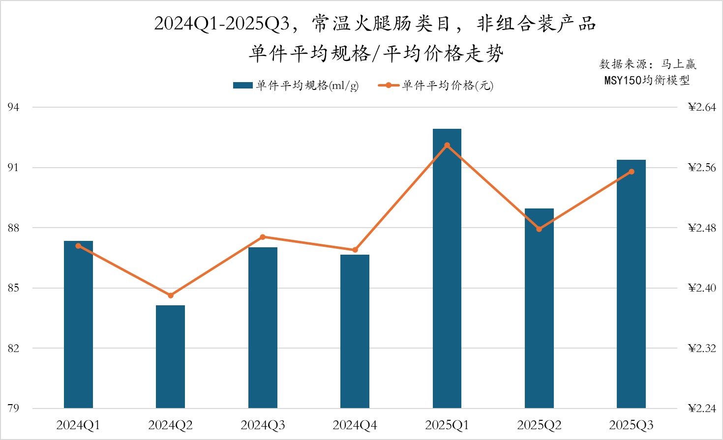 从常温火腿肠非组合装的单件平均价格和平均规格来看,二者在2024Q1至2025Q3期间均呈现同频波动,整体先升后降。在2025Q3,常温火腿肠非组合装的单件平均价格和平均规格均达到次高峰,其中单件平均价格超过2.55元,单件平均规格则超过91克,仅次于2025Q1的峰值。