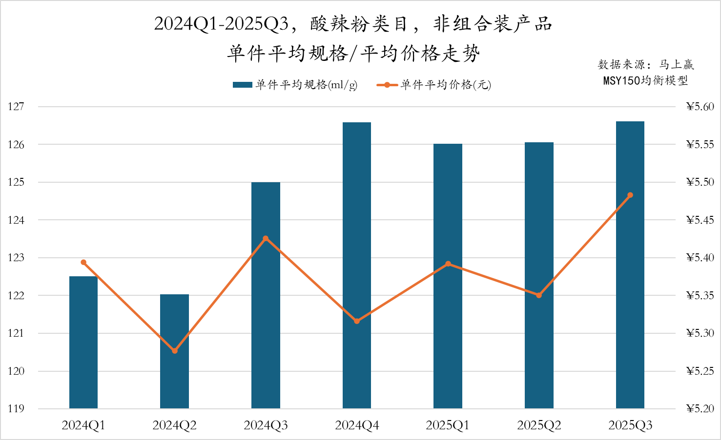 2024Q1-2025Q3,酸辣粉类目非组合装产品单件平均规格有一定增长,并在2025年Q1-Q3基本保持稳定;单件平均价格上,整体有一定波动上涨的趋势。