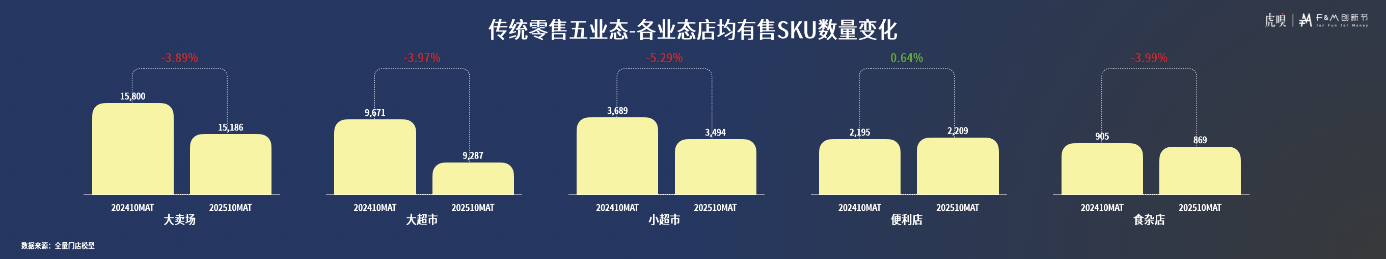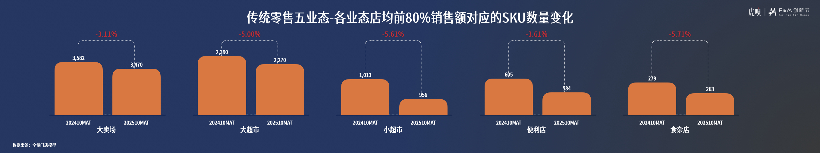 最后,我们将有效SKU(有售)和核心SKU(前80%销售额贡献)对比来看,同样是2025对比2024,可以看到,首先是“三七法则”非常的明确,基本所有的业态都是30%的SKU贡献了80%的销售额,余下70%的SKU贡献20%的销售额。其次是这种集中的趋势,基本在各业态中都在加剧,除了大卖场之外,其他业态都在聚焦核心SKU,核心SKU的数量和占比都更小了,也就是渠道在浓缩——越来越少的SKU在贡献着80%的销售额。