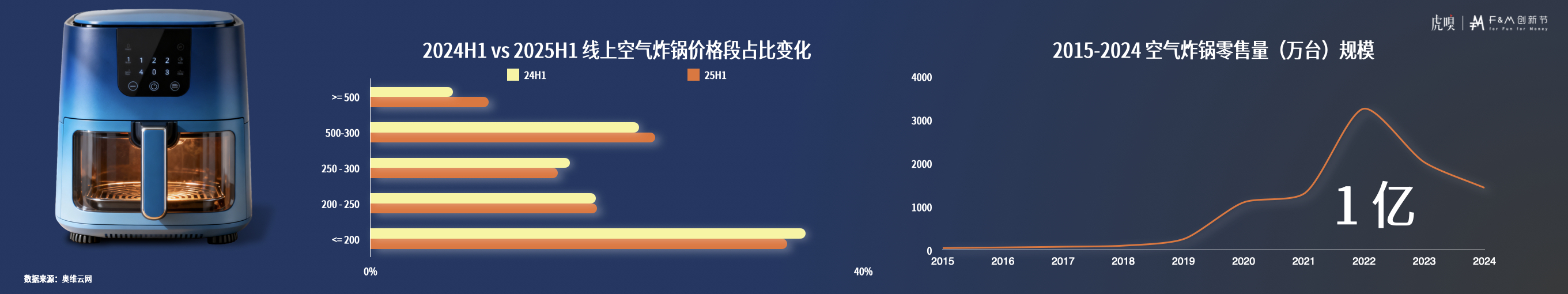 来自奥维云网的数据显示,空气炸锅的主要价格带已经下移到了300元以下,作为厨房小家电的购买门槛已经非常低,这也带动了消费者们的“疯狂购买”——过去四五年里,中国的电商平台卖出了超过1亿台空气炸锅,而中国县城以上市场大概有4亿个家庭,也就是说空气炸锅在城镇家庭的渗透率已经突破25%。