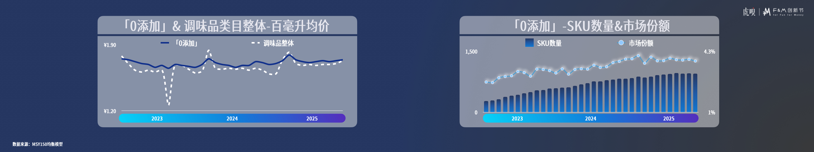 从数据可以看到,零添加产品的均价在过去确实比类目整体的均价稍微高一点点,但现在也开始趋同,或许可以说明概念所能够带来的溢价正在消退。每个类目都需要新概念来驱动增长,所以2025年3月之前,零添加调味品的SKU数量和市场份额都在快速增长,但其实在3月以后,可以看到,份额已经有着比较明显的掉头向下的趋势,SKU数量也不再快速增长,甚至将在未来随着法规的临近逐渐下滑。