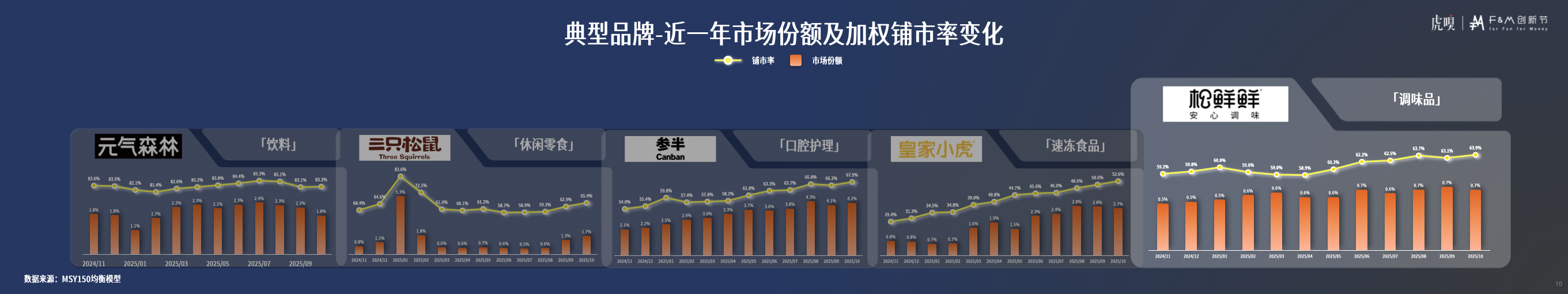 最后是调味品类目里面的松鲜鲜,他们抓住了调味品健康化、原料高端化的趋势,主打松茸添加的高端路线,从线上的概念吸引、品类构建、到线下的铺货增长,对传统调味品的味精、甚至酱油等等,都带来了一些影响,加权铺市率也是超过60%,成长很快。