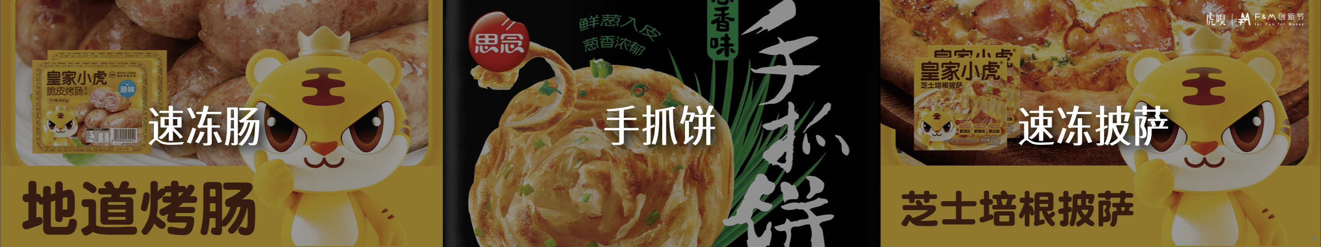 现在增长非常好的三个速冻食品品类是速冻烤肠、手抓饼、速冻披萨,皇家小虎通过在速冻烤肠、速冻披萨中的快速成长成为了速冻食品类目中的新晋黑马,思念则在手抓饼类目中领先。从在速冻食品大类中的占比以及销售额同比增速来看,这些品类都在同比去年快速增长,而且还在持续增长。