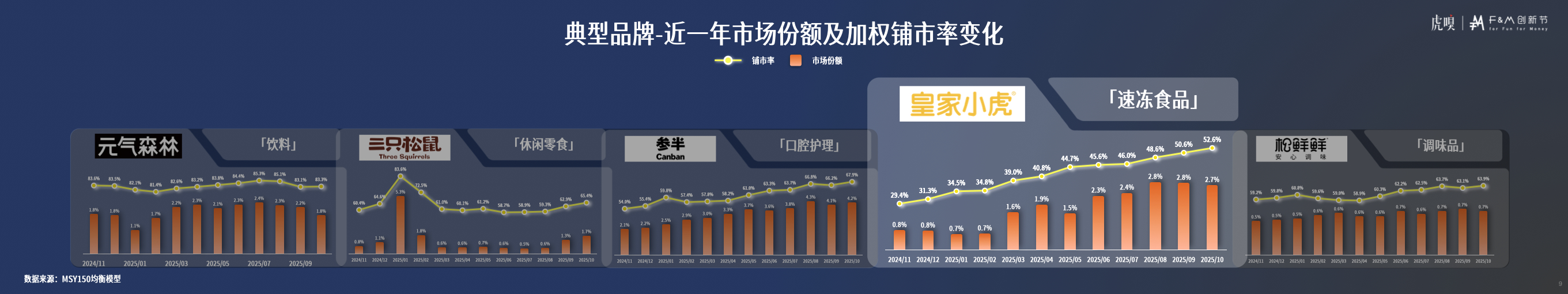 第四个是冻品赛道的黑马——皇家小虎。皇家小虎能够快速跑出来,一方面抓住了厨房烹饪方式的革新,另一方面则是抓住了消费者对于速冻品类需求的变化,所以增长非常的迅猛。从最早在线上做分仓履约突破冷链物流的限制,到现在也开始快速地做传统线下零售的铺货,已经有了超过50%的加权铺市率,市场份额也一路快速上涨。