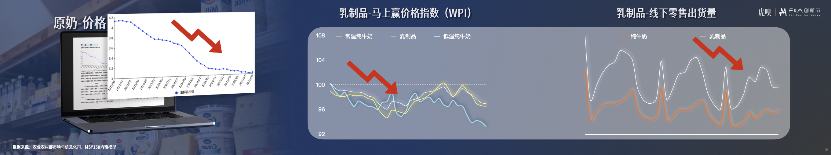 先看类目面对的压力,左边这张图是农业农村部发布的生鲜乳收购价格变化,可以看到,整体下滑了四分之一左右,但好消息是目前已经开始企稳了;中间这个图是马上赢价格指数,监控类目的价格水平同比变化,其中白色线是乳制品整体,黄色线是常温奶,蓝色线是低温奶,可以看到乳制品整体价格指数接近100,也就是同比去年没有太大变化,但发展非常好的低温纯牛奶,作为乳制品类目中销售额同比增速最高的品类,价格却在同比大幅下滑。