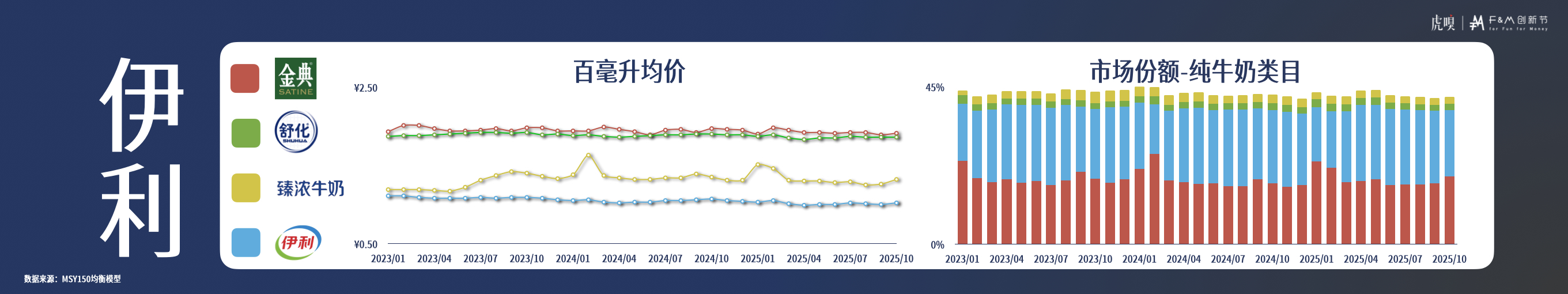 先看蒙牛,从高端的特仑苏到大众线的蒙牛母品牌,特仑苏的价格和份额基本没变化,但蒙牛母品牌的价格和份额都在下滑,基于数据合理推测,更多的消费者可能在从百毫升均价更低的母品牌,向着特仑苏等高端品牌流动。
