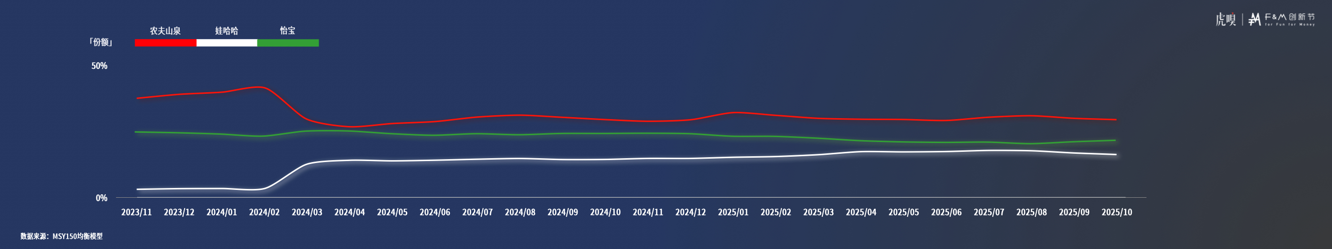 去年我们分享时就提到过农夫山泉和娃哈哈的包装水市场份额之争,但是一年时间下来,娃哈哈依然保持稳中有升,农夫山泉虽然在去年受到了较大的影响,但也守住了基本盘,重新进入上行通道当中,受影响最大的,反而是“隔岸观火”的怡宝。其在2024年3、4月时,市场份额一度摸到了第一名农夫山泉,但在一年多以后的2025年7、8月,其市场份额已经几乎要被娃哈哈追上。
