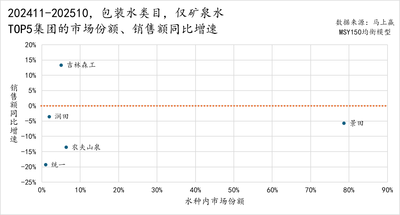 从2025年1-10月,包装水类目TOP5集团的市场变动来看,娃哈哈虽然增长势头已经放缓,但也守住了新夺下的“阵地”;农夫山泉虽然在去年刚刚被卷入漩涡时略显慌乱,但也靠着进军纯净水赛道的“绿水”产品,稳住了阵脚;景田、康师傅各有各的天地,虽然也受到了类目竞争加剧带来的影响,但整体还算平稳。