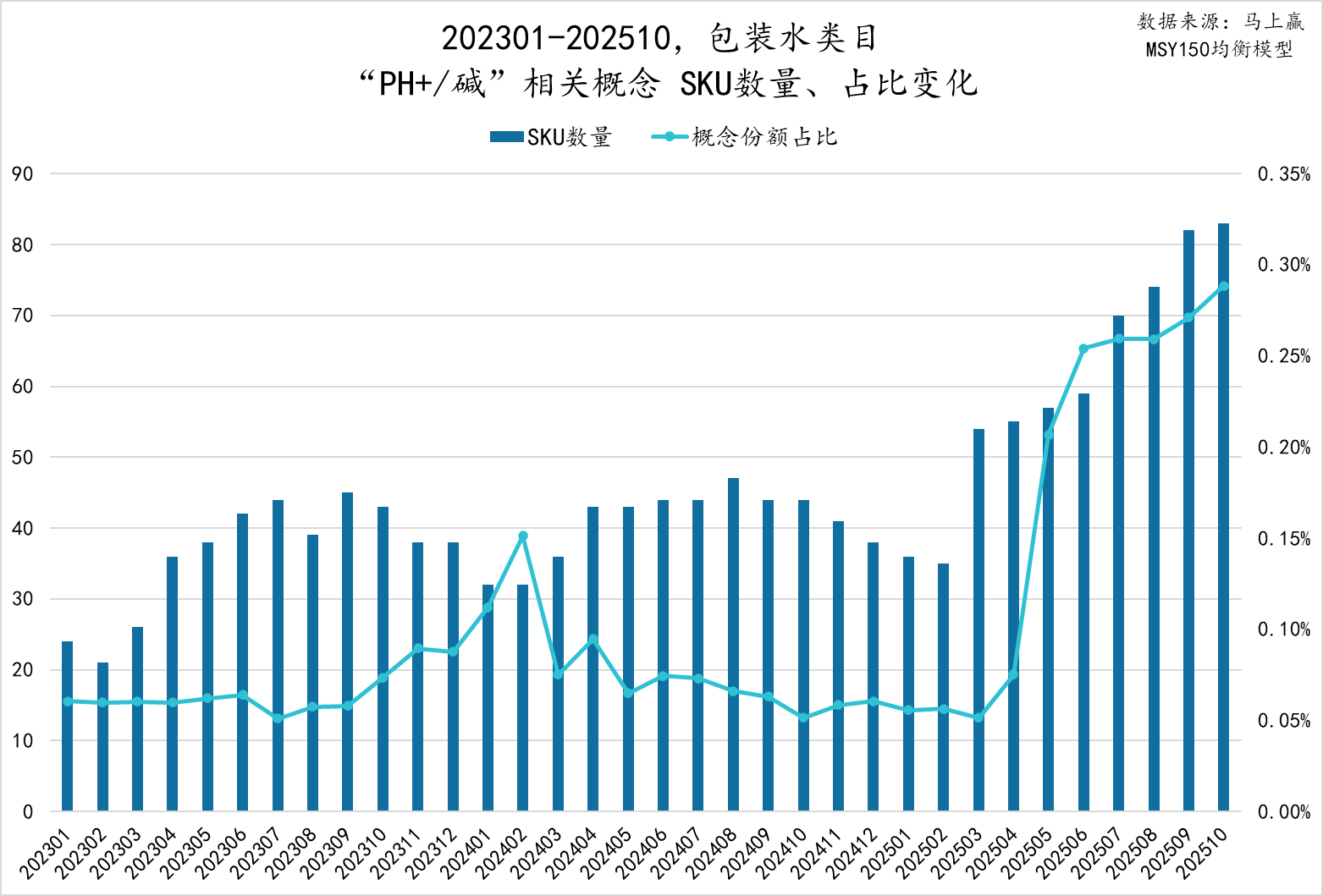 尽管碱性饮食的概念一直备受争议,但在过去一年,跟“PH+/碱”相关的饮用水SKU数量明显上升,并且市场份额也有大幅度的增长。虽然品牌方在广告法的限制下推广内容受限,但在社交媒体上,碱性水与健康、长寿甚至生育的功能性联想,激发了消费者对这一概念饮用水的追捧。这种社交媒体上的讨论和消费者口碑推动了碱性饮用水的市场需求,并促使相关产品的市场份额不断攀升,在今年获得了大幅的增长。