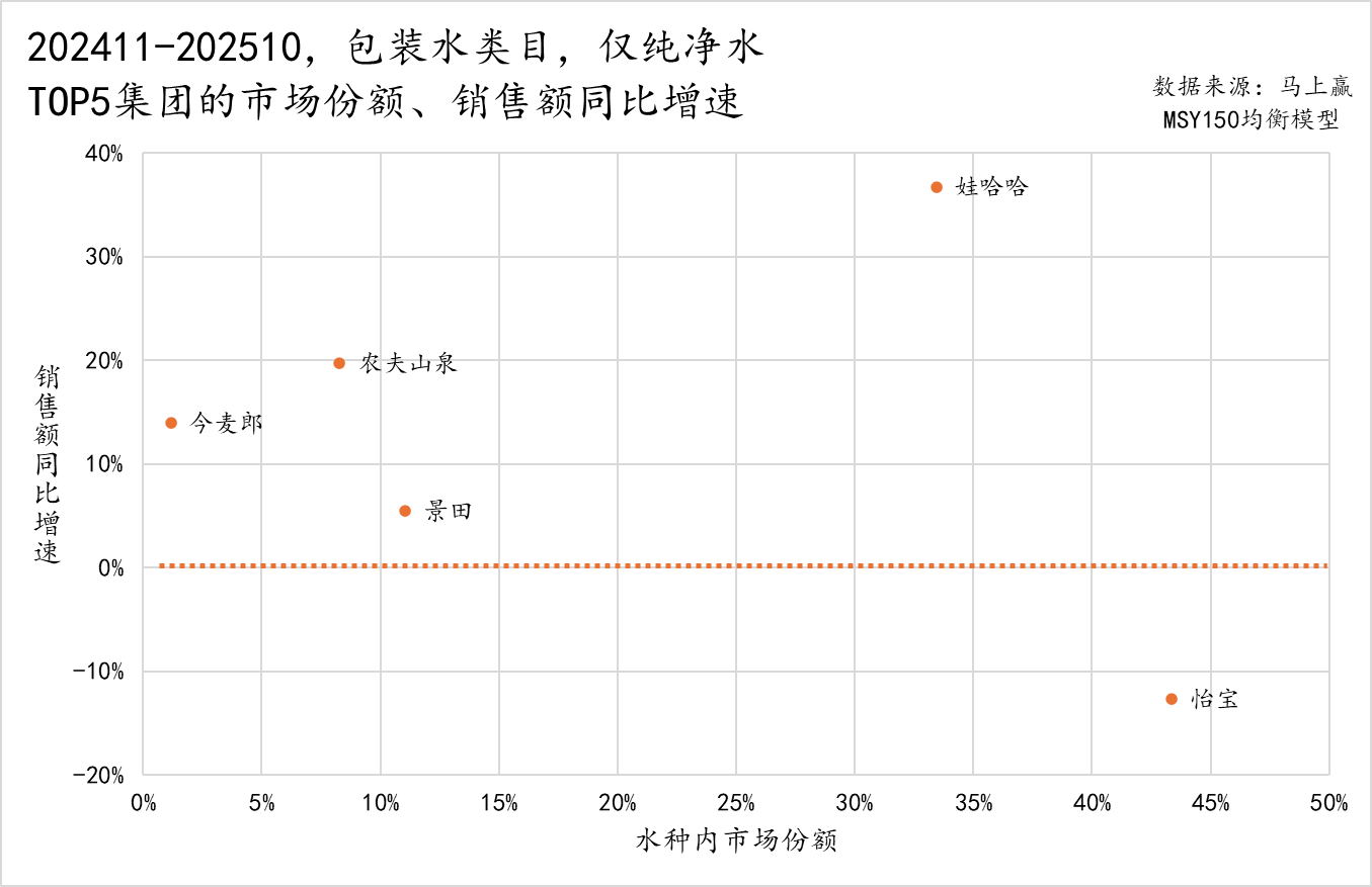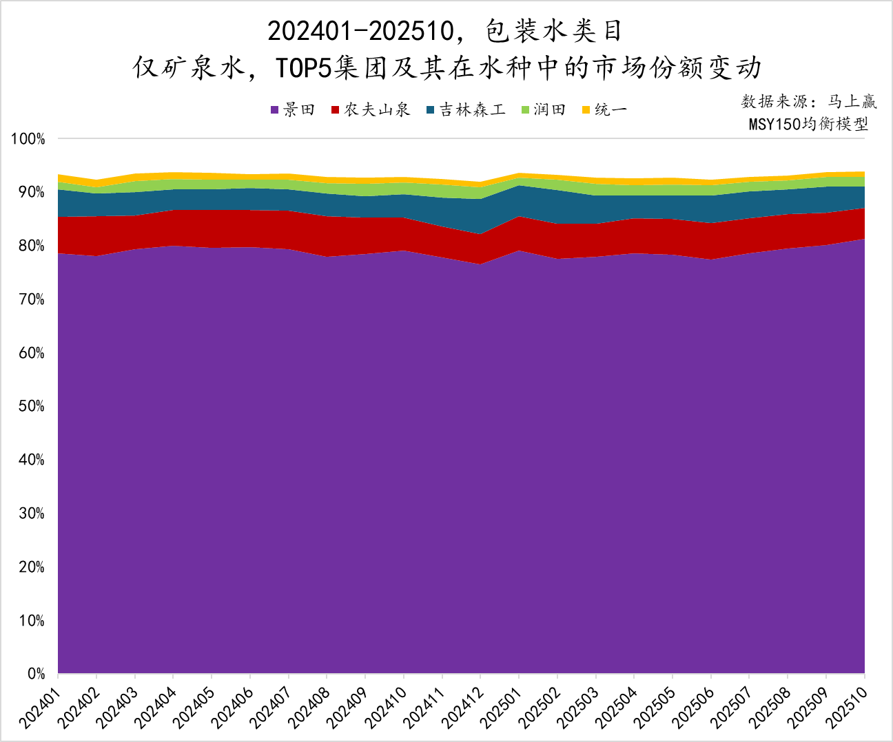 在纯净水水种中,怡宝的市场份额已经从2024年年初高点时的70%+,下滑至2025年8月的低点约40%,在该水种内的市场份额跌去了快一半,下行显著。与此对应的是娃哈哈的显著增长,以及后来加入纯净水水种的农夫山泉。值得注意的是,农夫山泉在纯净水水种中的市场份额高点出现在2024年7、8月,在2025年,其市场份额也有一定程度上的同比下滑。