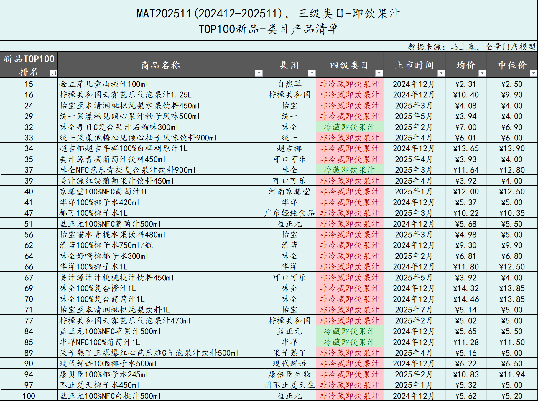 即饮果汁类目是MAT2511时间段中,TOP新品最多的类目,合计达到了30款,其中冷藏即饮果汁4款,非冷藏即饮果汁26款,我们分开来看。