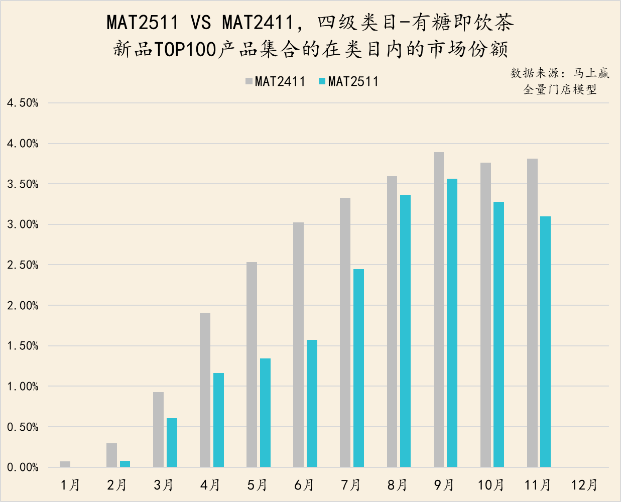 相比来说,有糖即饮茶今年TOP新品的市场份额表现要好于无糖即饮茶的表现,但依然不及MAT2411 TOP新品在当年的市场份额表现。